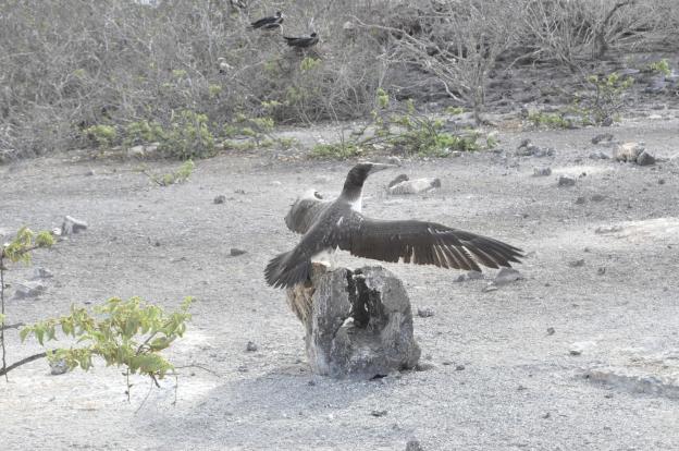 A juvenile booby practicing flight, unsuccessfully.