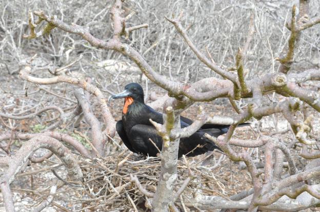 A male frigatebird sitting on his nest. Although you can’t see his back well the feathers have a purple sheen which leads me to say that this is a Magnificent Frigatebird.