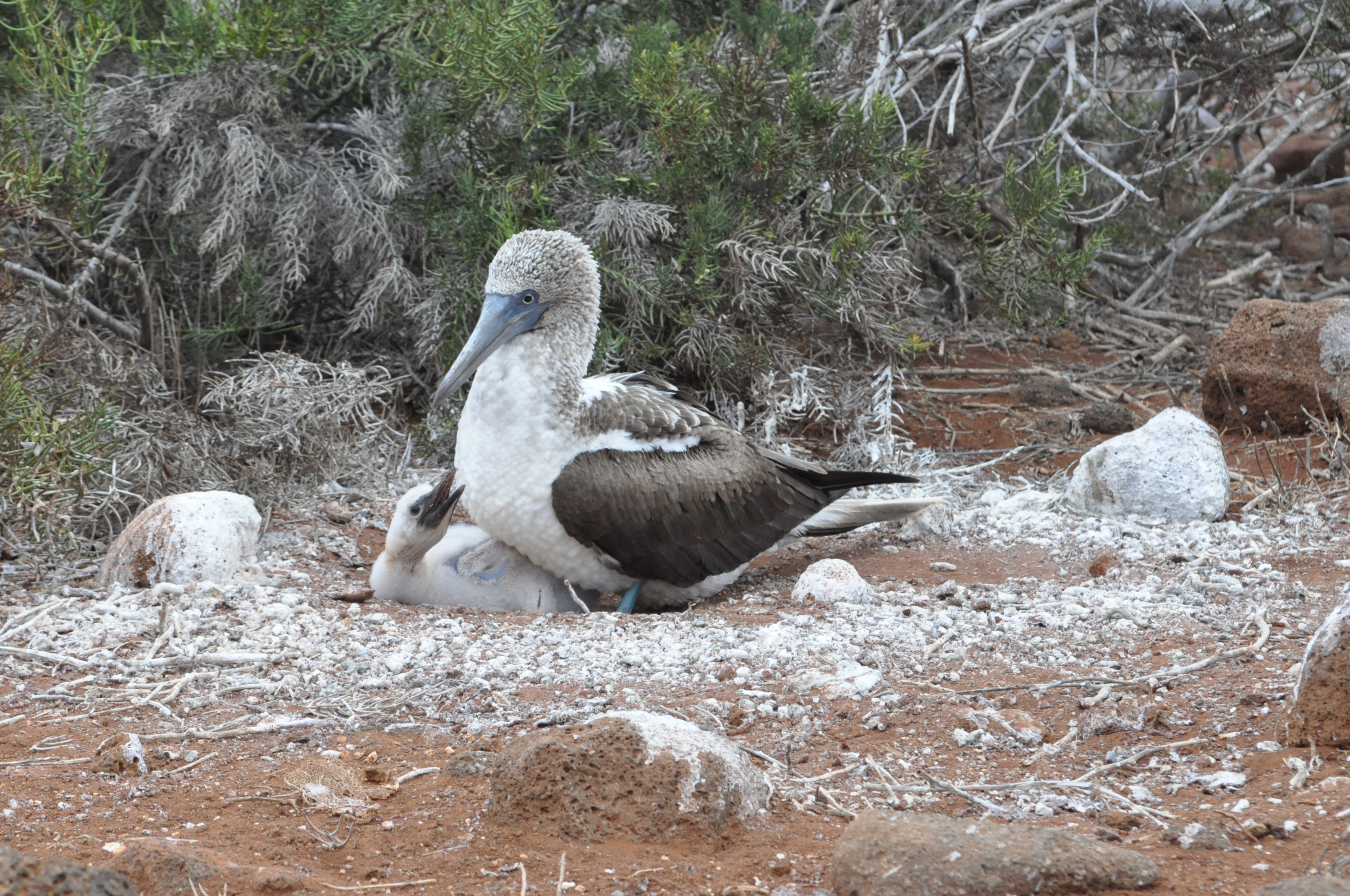 This blue footed booby with it’s baby demonstrates two fun facts about boobies. The first is that blue footed boobies have blue skin, which you can see on the baby, the second is the poop nest, wherein boobies projectile poop in a circle to make their nest boundaries.