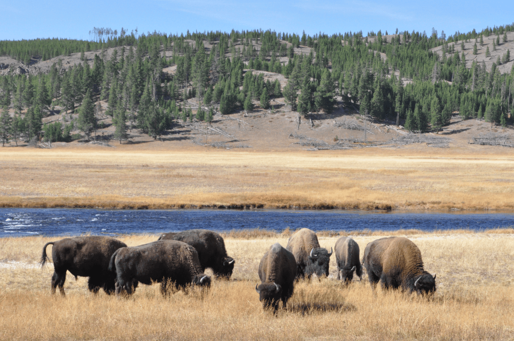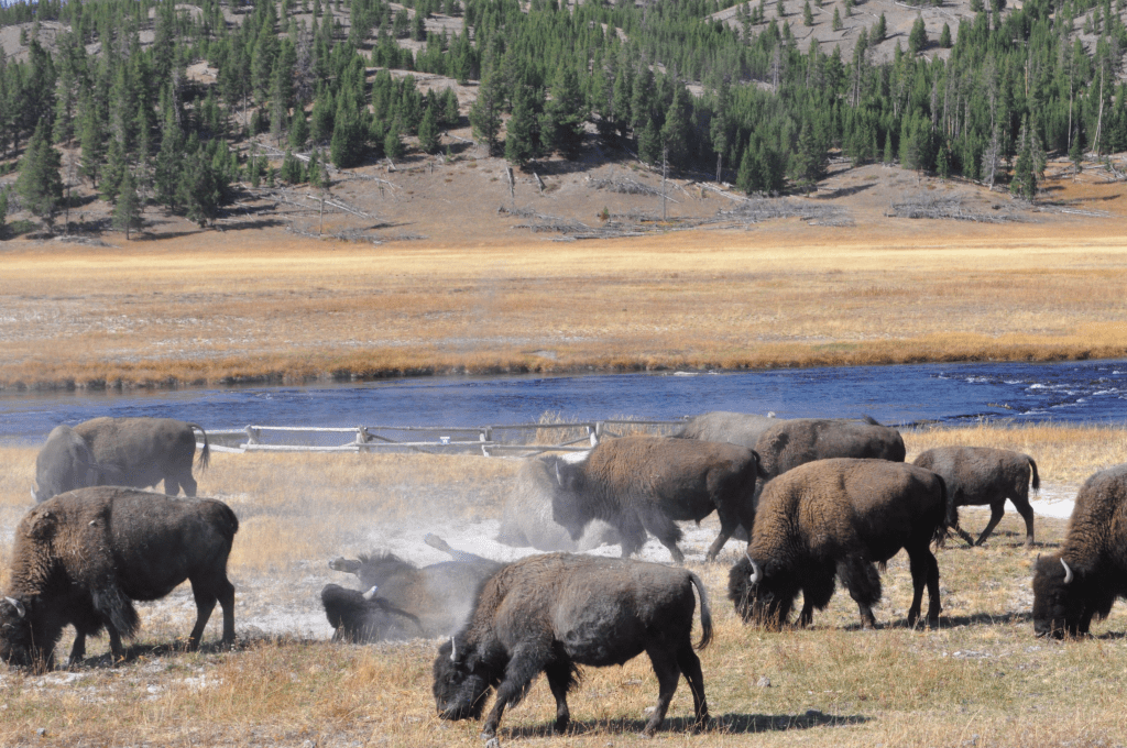 To see the Grand Prismatic Spring (and Fairy Falls) skip the Fairy Falls Trailhead and the Midway Geyser Basin and head up to Fountain Flat Drive to park at the trailhead at the end of the road. Fountain Flat Drive itself is a great spot to see bison. Hike out on the dirt road (red dashed line on the map) past the three trail junctions to the Grand Prismatic Overlook. You will see a lot of people here since it’s much closer to the road, but it’s the best view of the basin. Once you’ve drunk it all in head back the way you came and turn west onto the first trail junction to Fairy Falls. After enjoying Fairy Falls continue on that trail, turning east at the first trail junction towards Spray Geyser and Fairy Springs. After 2.1 miles you can either rejoin the dirt road to head back to the parking lot or add on another 2 miles by taking the longer loop through Sentinel Meadows.